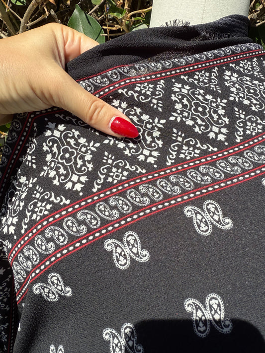Black White Red Paisley Dot Stripe Border Polyester Crepe Woven "Midnight Rodeo"