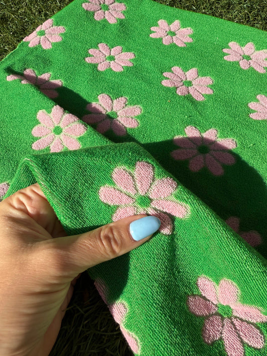 Green Pink Daisy Floral Polyester Terry Cloth Knit "Spring Daisy"