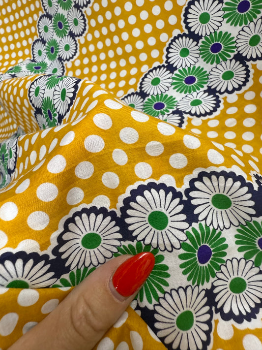 Yellow Green Blue White Daisy Retro Floral Print Cotton Voile Woven "Dandy"