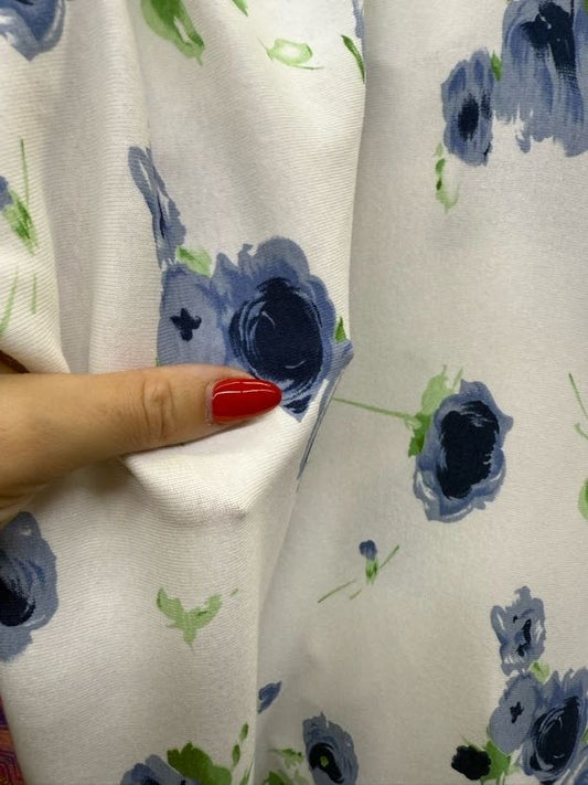 Blue Green White Floral Print Baby Rib 1x1 Vintage Cotton Spandex Jersey Knit "Blue Buds"