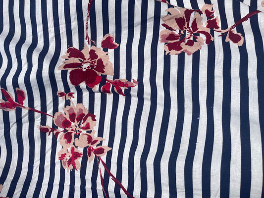 Navy White Stripe Pink Tropical Floral Print Cotton Linen Fabric "Hampton Day Trip"