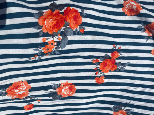Teal White Stripe Orange Rose Floral Cottage Core Cotton/ Linen "Capri Costal"