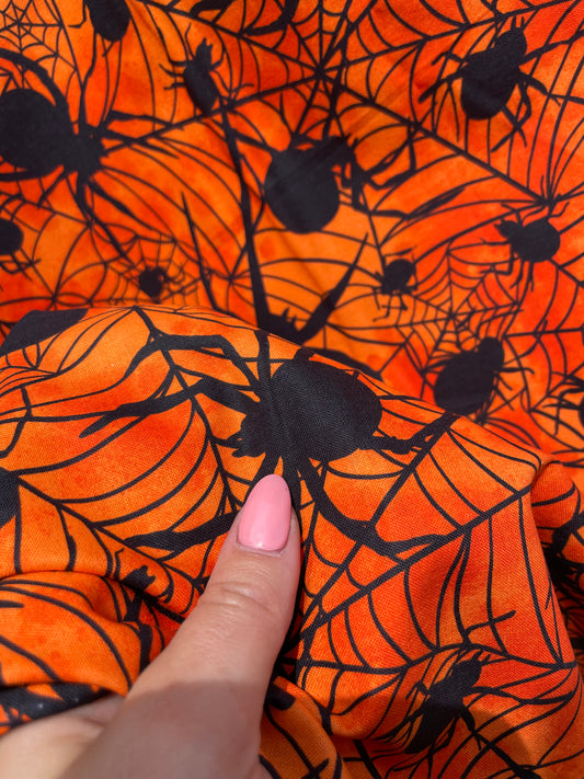 Orange Black Spider Web Cotton Quilt Poplin Halloween Print "Spidey Senses"