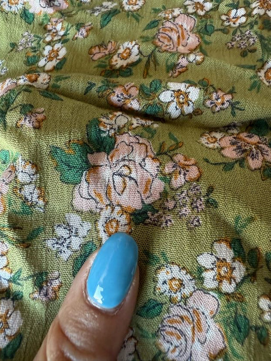 Olive Green Pink White Gold Black Floral Print Rayon Crepe "Tea Garden"