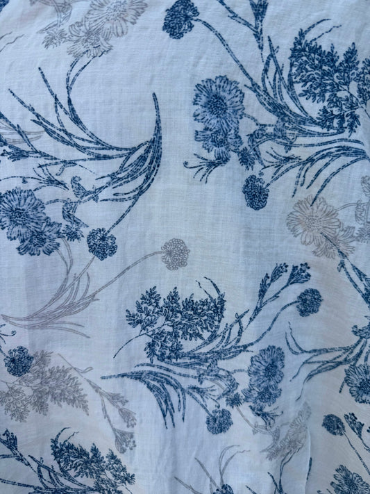 Blue White Gray Floral Rayon Challis Woven "Strawflower Bouquet "