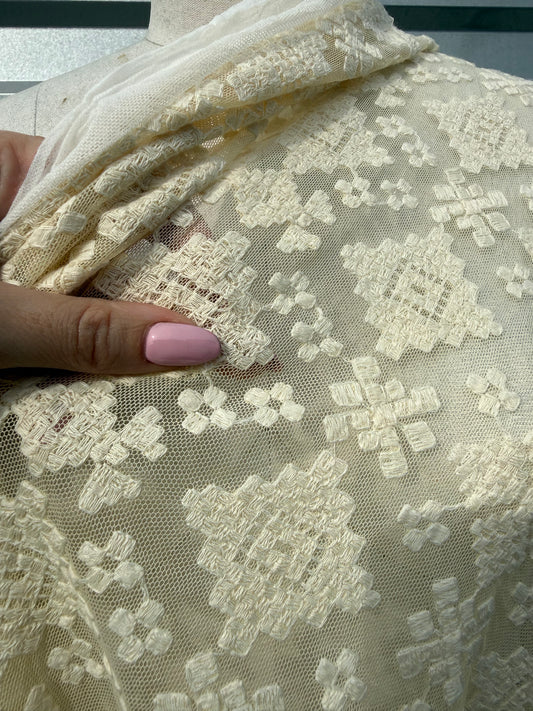 Ivory Geometric Embroidered Micro Mesh Lace Cotton Nylon Spandex Knit "Nyla"