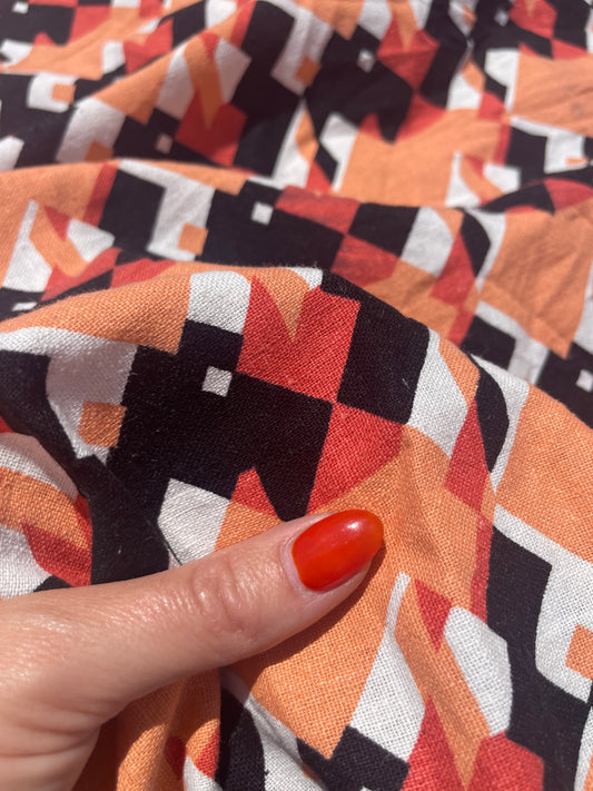 Coral Orange Peach Black Geometric Print Cotton/Linen "Minecraft Mountains"