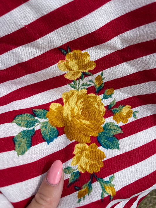 Red White Stripe Yellow Rose Floral Cottage Core Cotton/ Linen "Candy Roses"