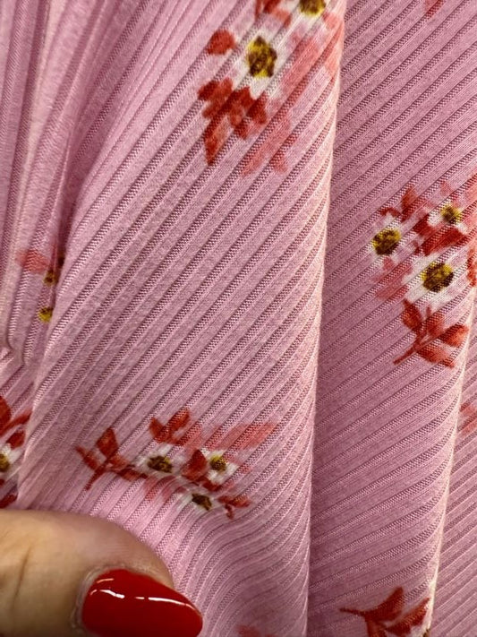 Pink Red White Yellow Floral Rib Polyester Spandex DTY Knit "Planted in Pink"