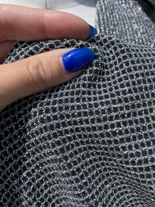 Black Silver Square Grid Polyester Spandex Stretch Knit "Chain Spark"