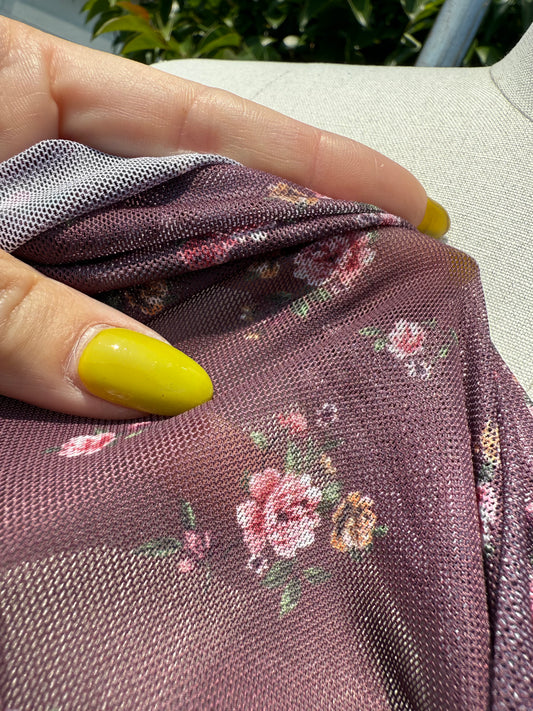 Burgandy Yellow Pink Green Floral Mesh Polyester Spandex Knit "Vintage Rose Veil"