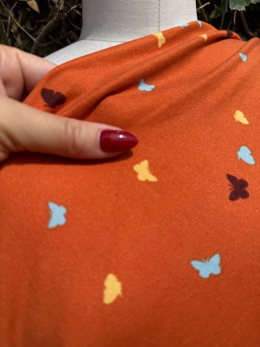 Orange Light Blue Yellow Brown Ditsy Butterfly Brushed Polyester Spandex Jersey DTY Knit "Autumn Wings"