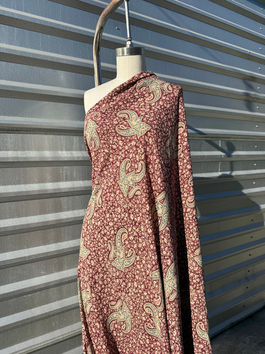 Burgundy Green Cream Paisley Print Rayon Crepe Woven "Santa Ana Sally"