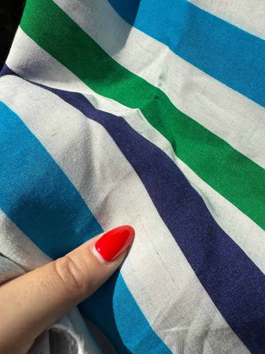 White Blue Green Vertical Stripe Rayon Challis Woven "Mike Ike"
