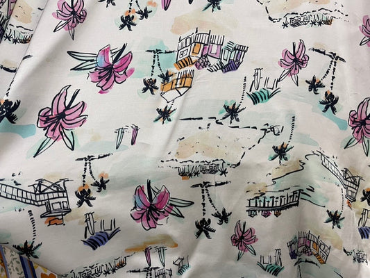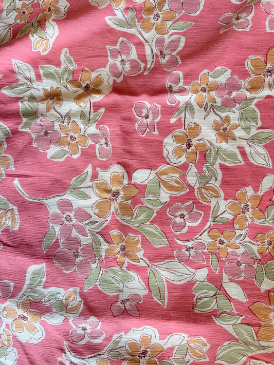 Pink Orange Green Off-white Floral Drawing Print Rayon Crepe Woven "Peach Blossoms"
