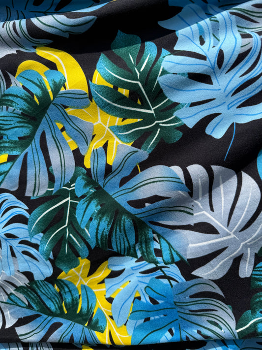 Aqua Blue Green Yellow Plant Palm Print Polyester Spandex DTY Jersey "Chasing Summer"