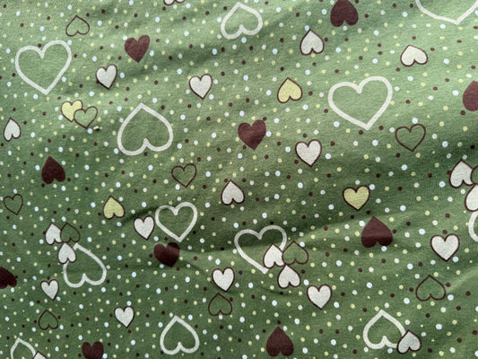 Green Yellow White Brown Hearts Dots Vintage Cotton Jersey Knit "Pop Heart Parade"