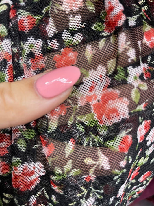 Black Red Green White Rose Floral Print Micro Mesh Stretch Knit "Blooming Rose"