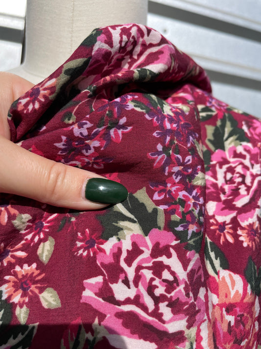 Burgundy Pink Lavender Green Rose Floral Rayon Woven Light Weight "Mila Rose"