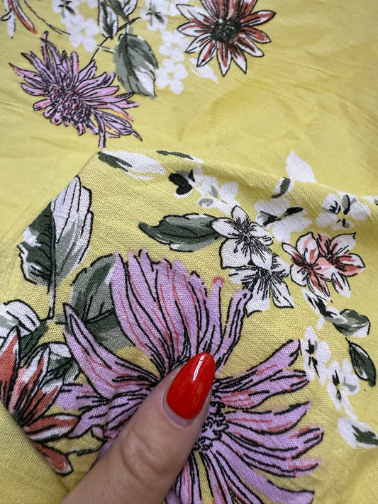 Yellow Pink White Floral Print Rayon Crepe Woven "Mellow Chrysanthemum"