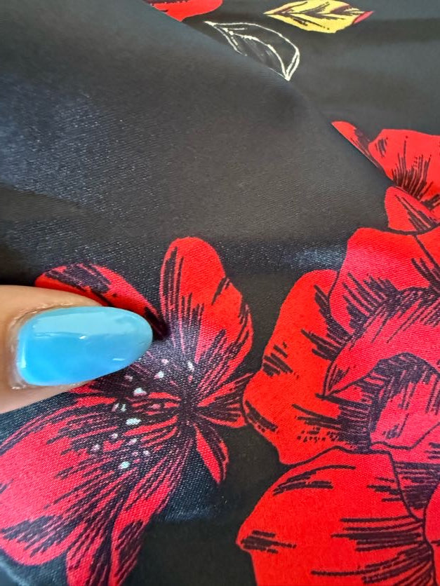 Elevate your evening wear with "Carmilla Evening," a bold polyester woven fabric featuring large red florals against a moody black backdrop. This daring print brings charm and enchantment to your new sewing projects, perfect for creating sophisticated, standout pieces that captivate every room. Sold by the yard to inspire your next elegant design.