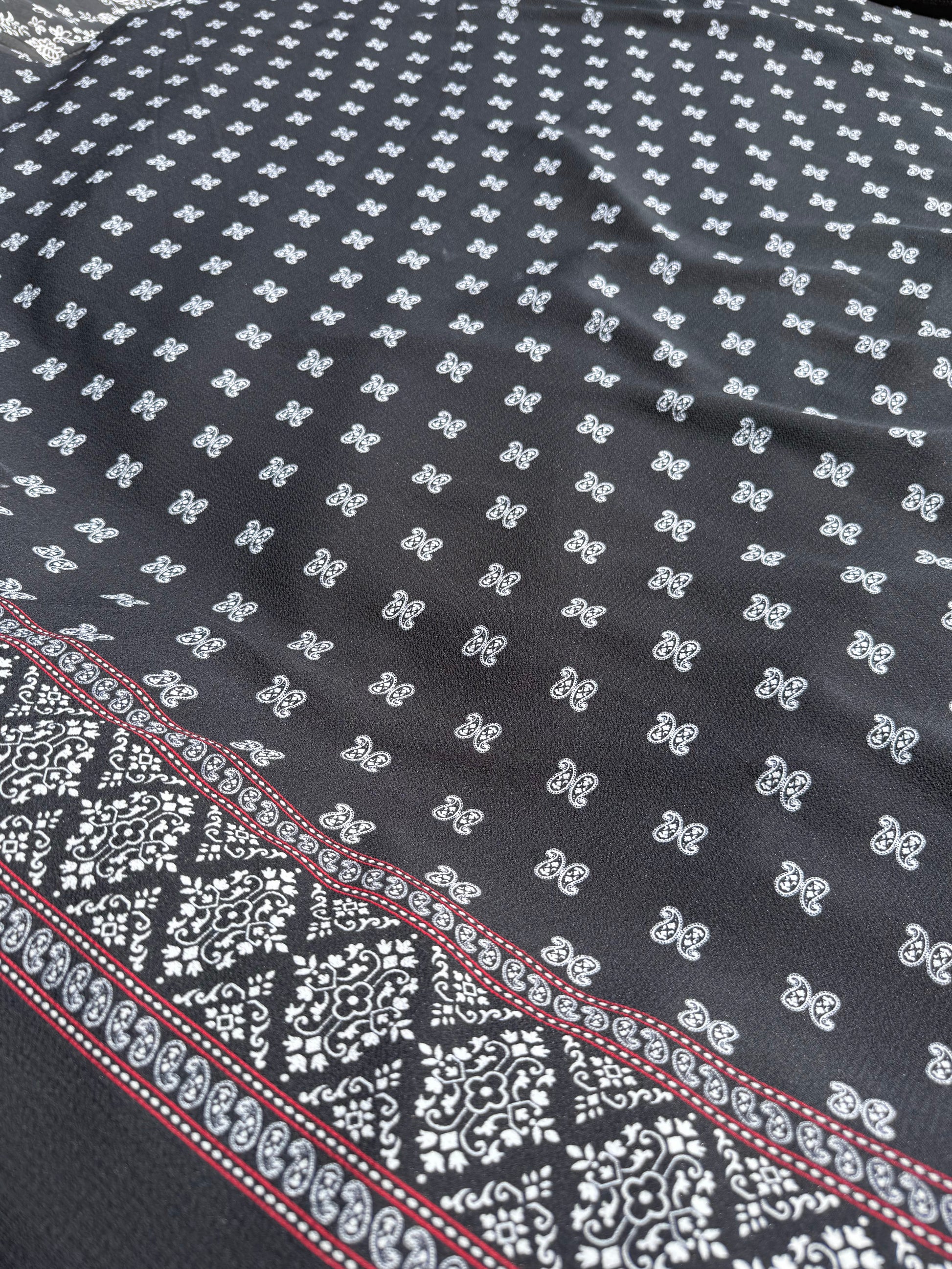 Bring a little wild west to your wardrobe with this lightweight Black White Red Paisley Dot Stripe Border polyester crepe woven fabric, perfect for moody cowboys or cowgirls. Sold by the yard, this deadstock treasure is your last chance to shop sustainably while starting fresh sewing projects. Its playful mix of paisley and stripes on the border adds bold character to any creation, making it a must-have for those who love style with a twist. Saddle up and stitch something unforgettable!