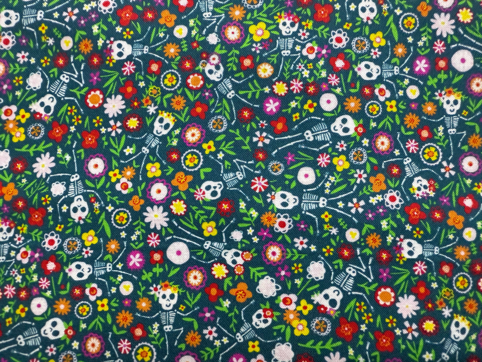 Add a touch of fun and uniqueness to your projects with our deadstock cotton fabric "Bailando con Flores." Featuring playful dancing skeletons and ditsy florals in lively blue, green, red, orange, yellow, purple, pink, and white, this versatile woven cotton is perfect for creating cheerful clothing, accessories, or home décor that stands out with personality.