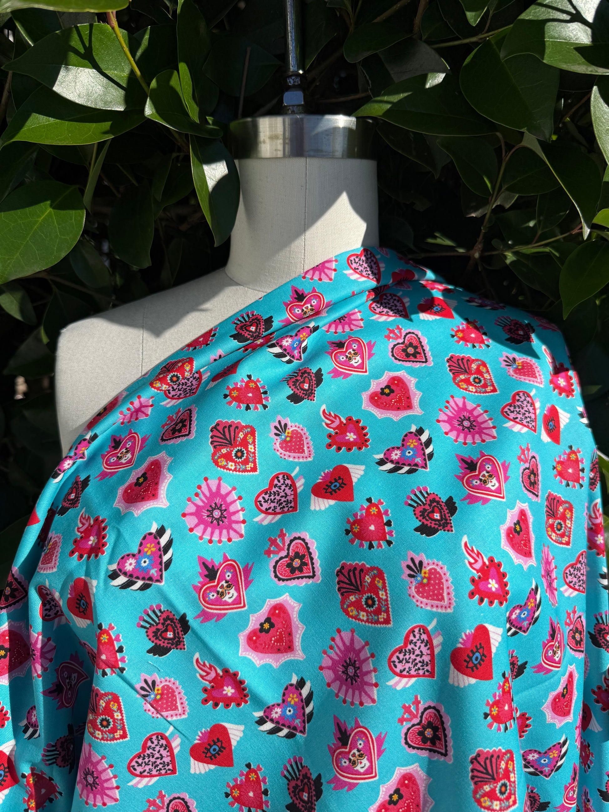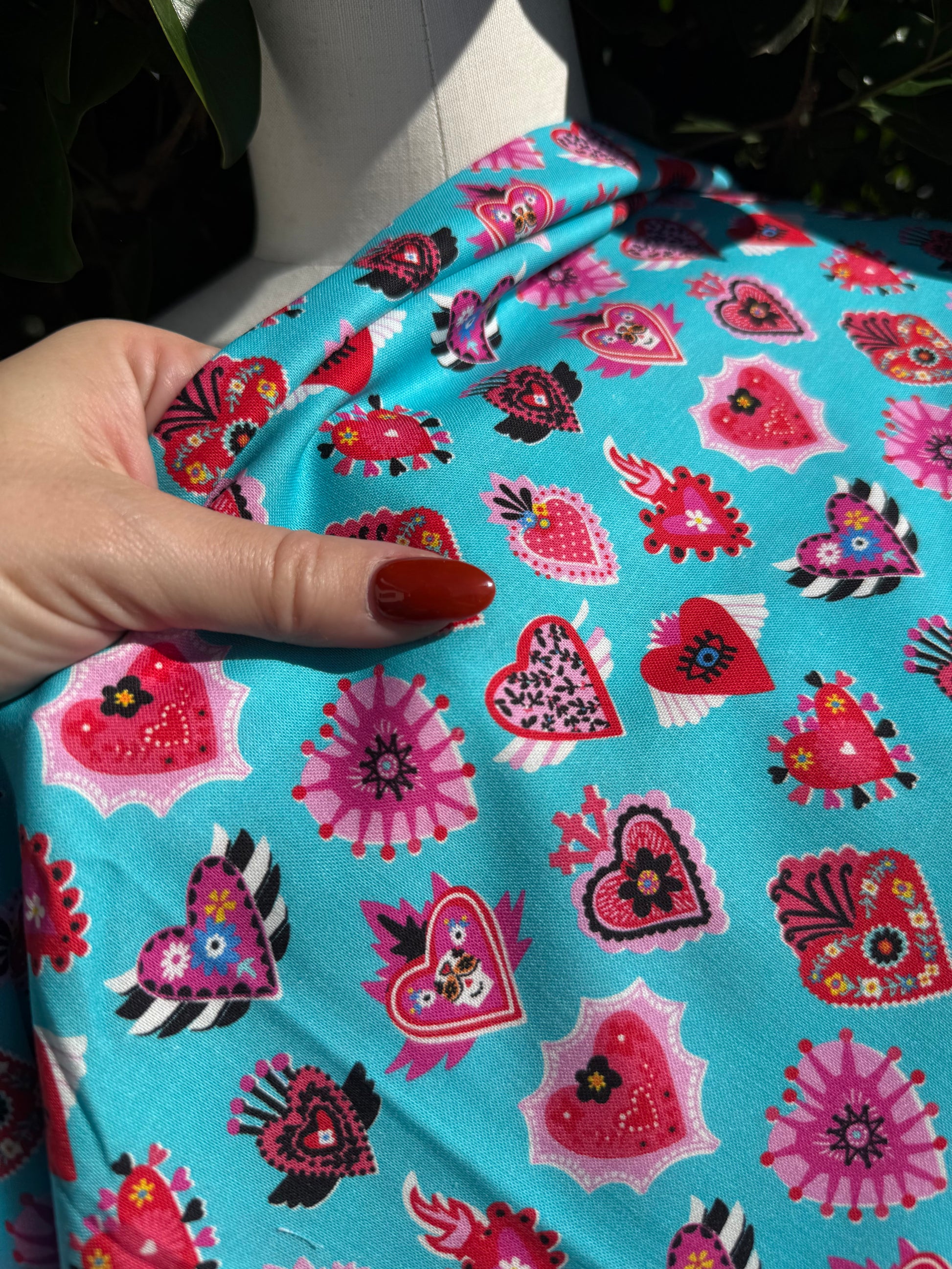 Bring vibrant energy to your new sewing projects with our deadstock cotton fabric "Mystic Flames of the Heart." Featuring playful Sacred Heart motifs in bright blue, red, pink, black, yellow, and white, this natural fiber fabric combines bold colors and unique designs to inspire fun, creative garments and accessories that truly stand out.