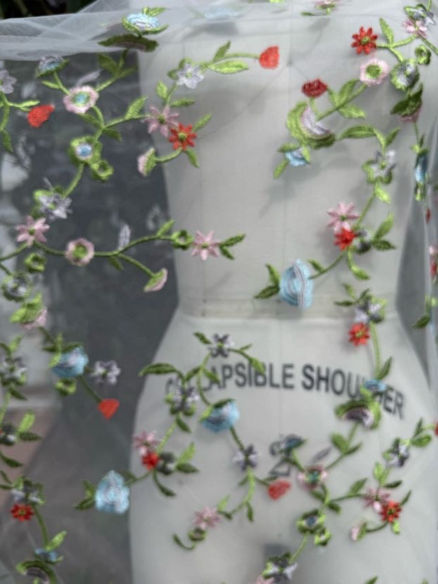 Elevate your creations with this unique embroidered lace mesh fabric, featuring a vibrant blue, red, pink, and green floral motif. Perfect as an overlay for skirts, tops, or dresses, it adds delicate flair and texture to any sewing project. Ideal for those seeking to make standout garments with a touch of elegance and artistry. Available by the yard for your custom designs.