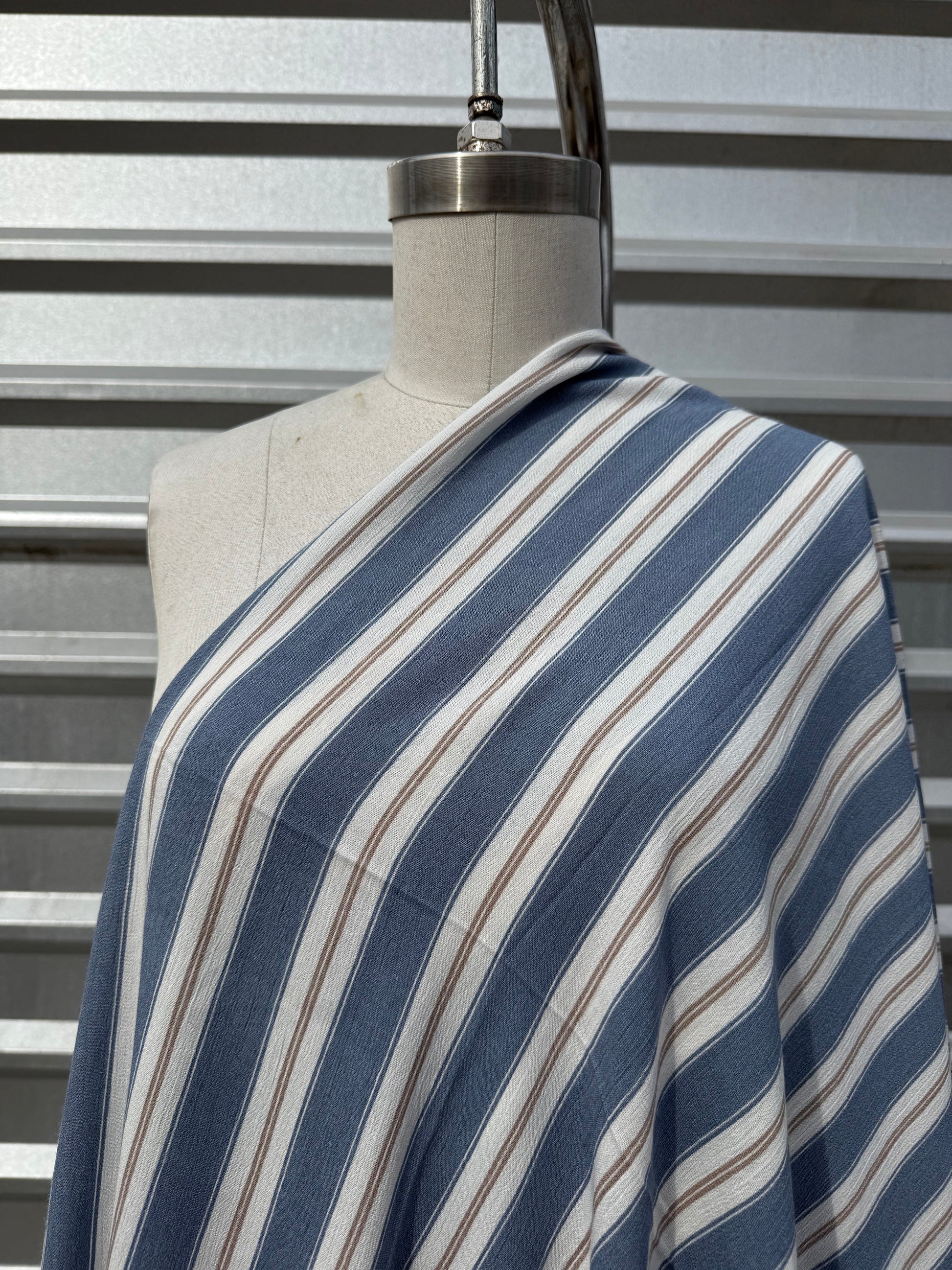 Blue White Tan Stripe Print Rayon Crepe Woven "Costal Rae"