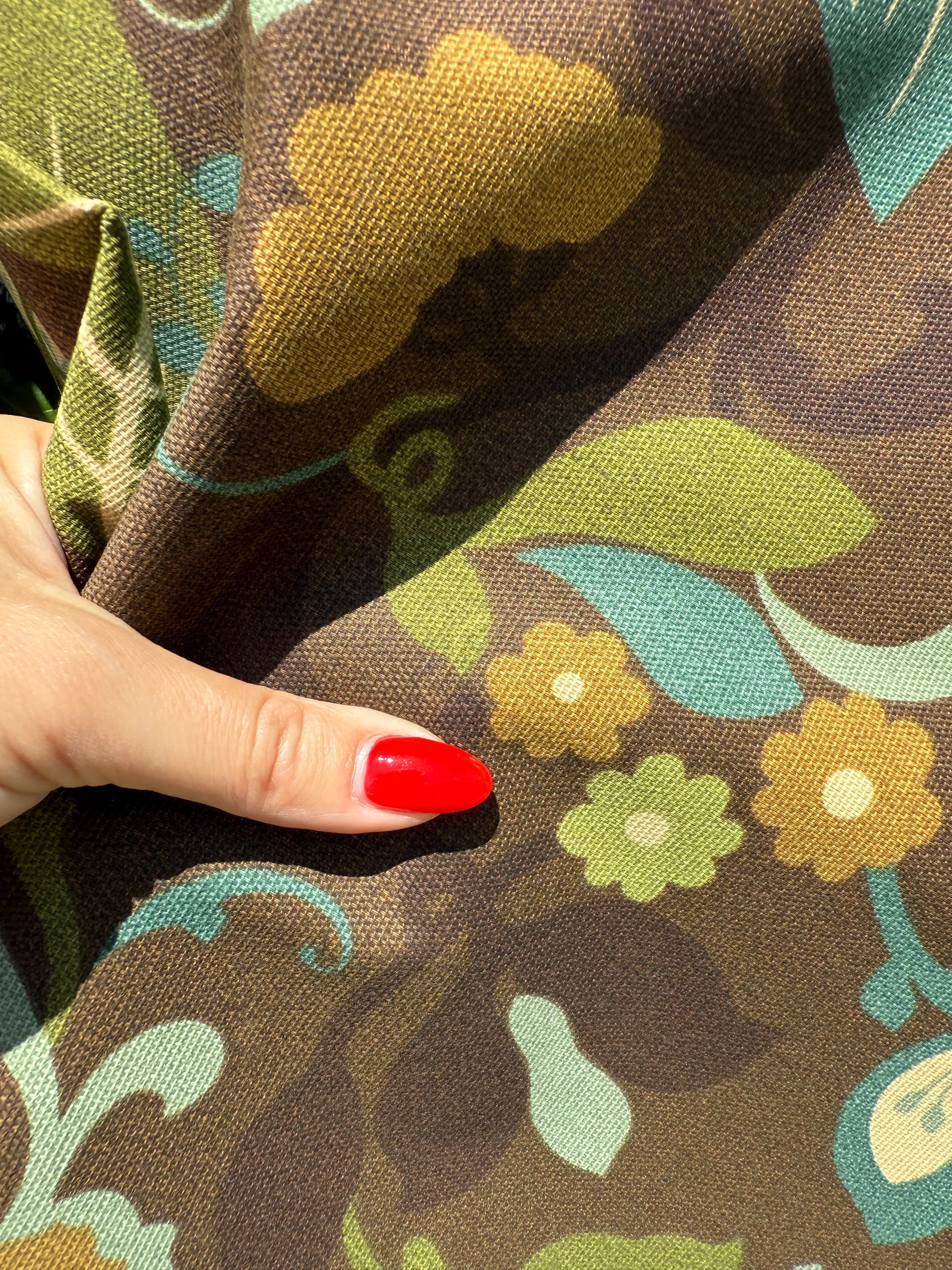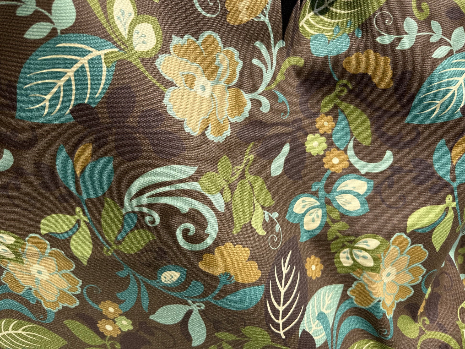 Bring a splash of retro charm to your projects with this Brown Green Teal Floral Swirl vintage cotton canvas. Printed in the USA nearly 20 years ago, this sturdy upholstery fabric is perfect for revamping a couch or crafting a standout pair of work pants and matching jacket. Its playful floral swirl pattern adds a unique twist to any sewing adventure, making your creations truly one of a kind.