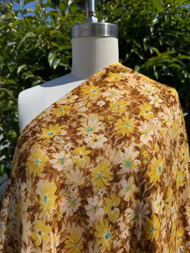 Discover the elegance of our Brown Yellow White Floral Daisy Print Rayon Crepe fabric. This soft, woven crepe features a charming floral pattern with bright spots, perfect for creating stylish, comfortable garments. Its smooth texture and breathable quality make it ideal for dresses, blouses, and more, adding a touch of warmth and sophistication to your sewing projects. Elevate your creations with this versatile, high-quality fabric by the yard.