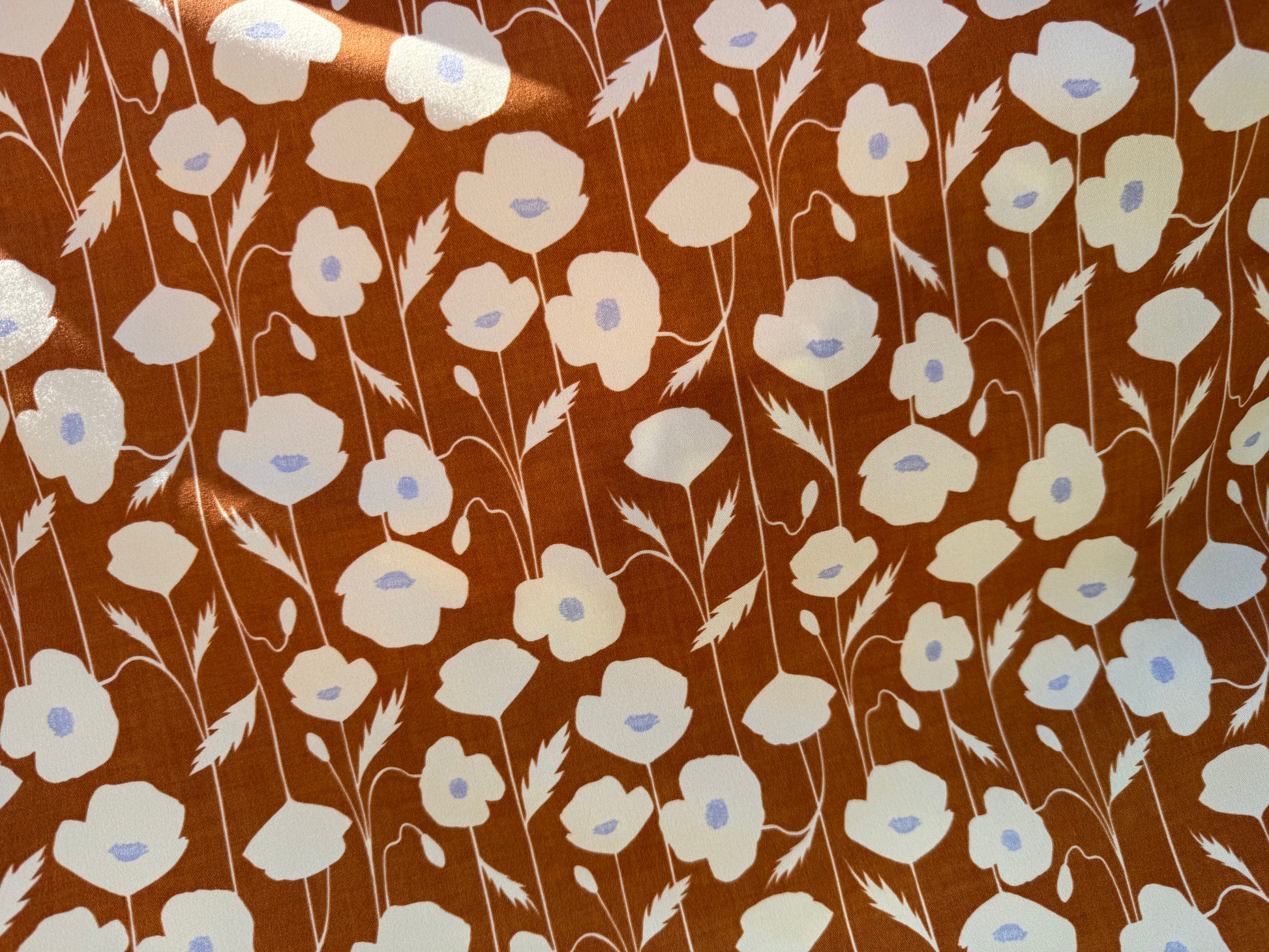 Celebrate the cozy spirit of fall with this lightweight cotton twill fabric, featuring golden and rust floral impressions on a soft white background. Ideal for new sewing projects, its breathable weave makes it perfect for creating stylish garments or accessories that capture autumn’s warm, playful charm. Let "Caramel Wildflowers" inspire your next cozy creation!
