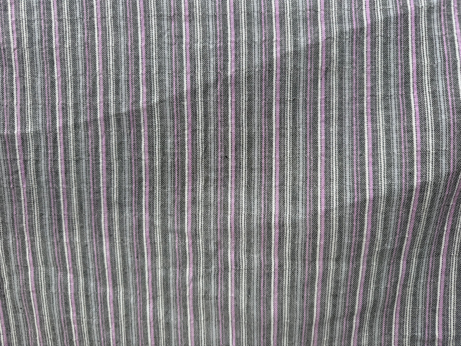 Discover the airy charm of Heather Tracks, a lightweight cotton gauze woven in soft grey, purple, and white stripes. Perfect for breezy summer garments, delicate quilting projects, or layered apparel, this breathable fabric drapes beautifully and feels gentle against the skin. Sold by the yard, it's an ideal choice for sewists seeking quality deadstock finds with character. Add this striped treasure to your stash today!