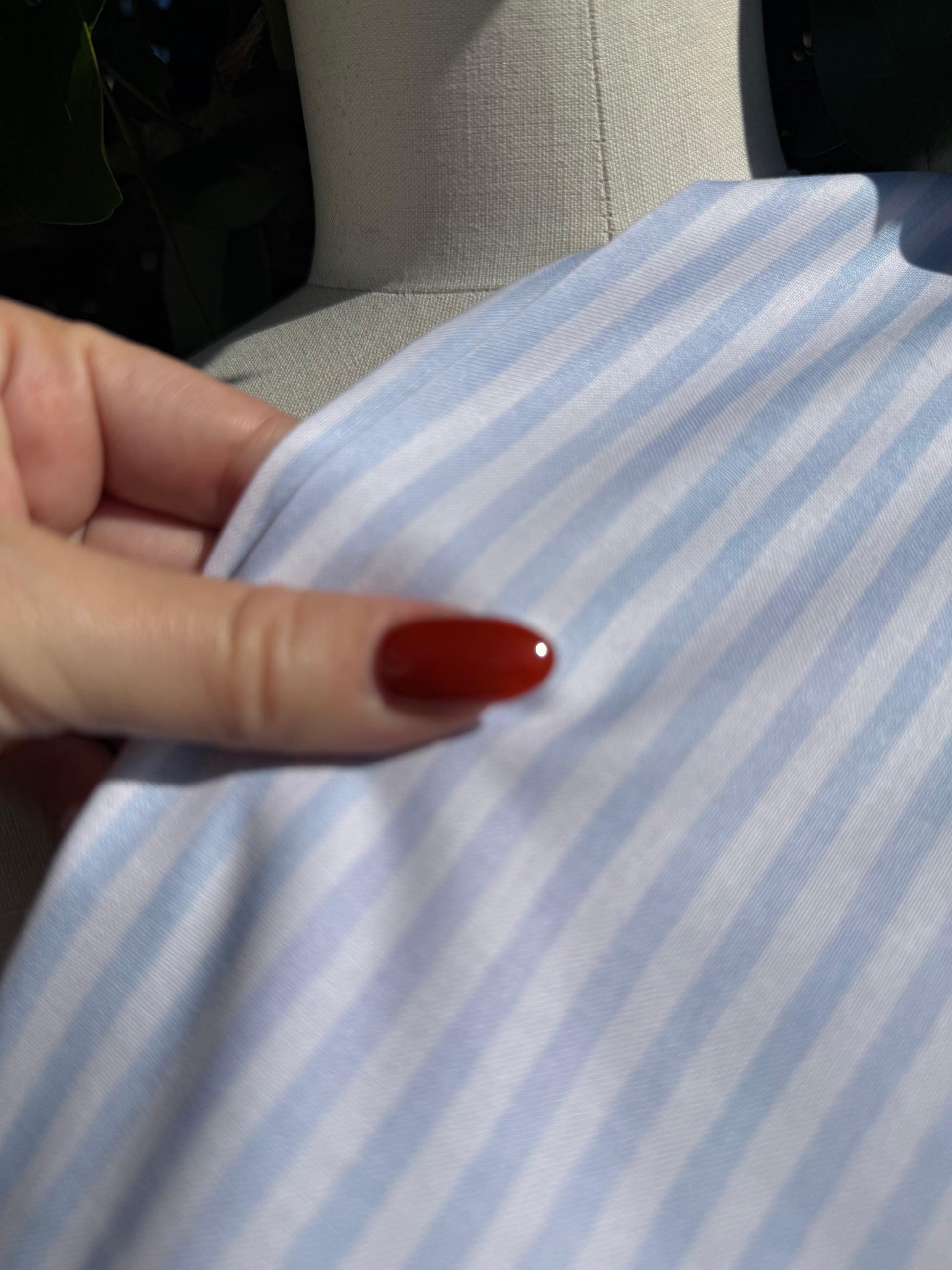 Capture the fresh, breezy spirit of summer with the Light Blue White Vertical Stripe Quilt Cotton Poplin from the "Ocean Breeze" collection. Its classic stripes evoke seaside vibes, making it perfect for quilts, button-up dresses, and stylish bags. Soft and durable, this fabric is your playful companion for bringing new sewing projects to life with effortless charm.