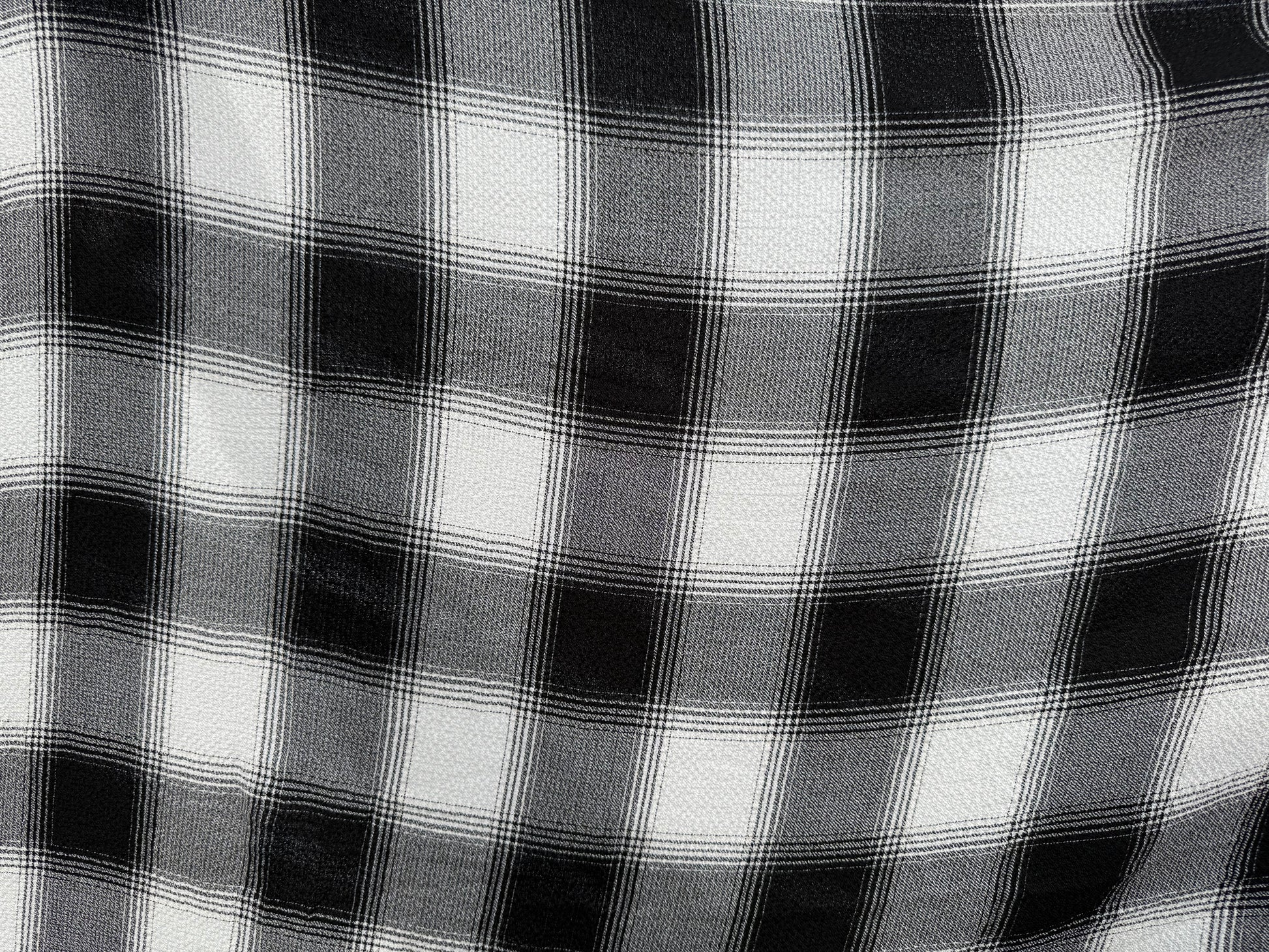 Crisp black and white plaid meets effortless elegance in this wrinkle-resistant polyester crepe. The fluid drape makes it perfect for breezy blouses, flowing skirts, or any project that calls for movement without the fuss. No ironing required—just cut, sew, and go. Sold by the yard so you can grab exactly what you need.
