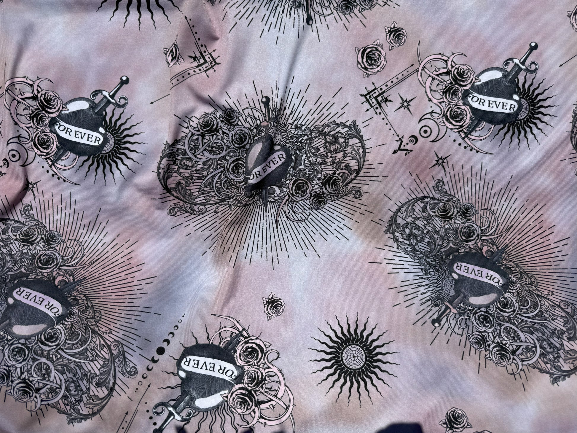 Pink Black Tie-dye Sword in Heart Sun Floral Ink Moon Polyester Spandex Jersey Knit "Love Never Dies"