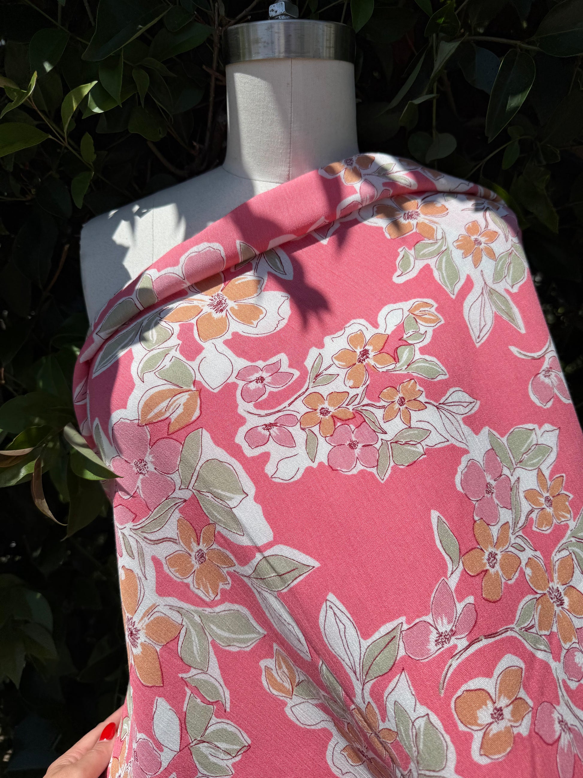 Pink Orange Green Off-white Floral Drawing Print Rayon Crepe Woven "Peach Blossoms"