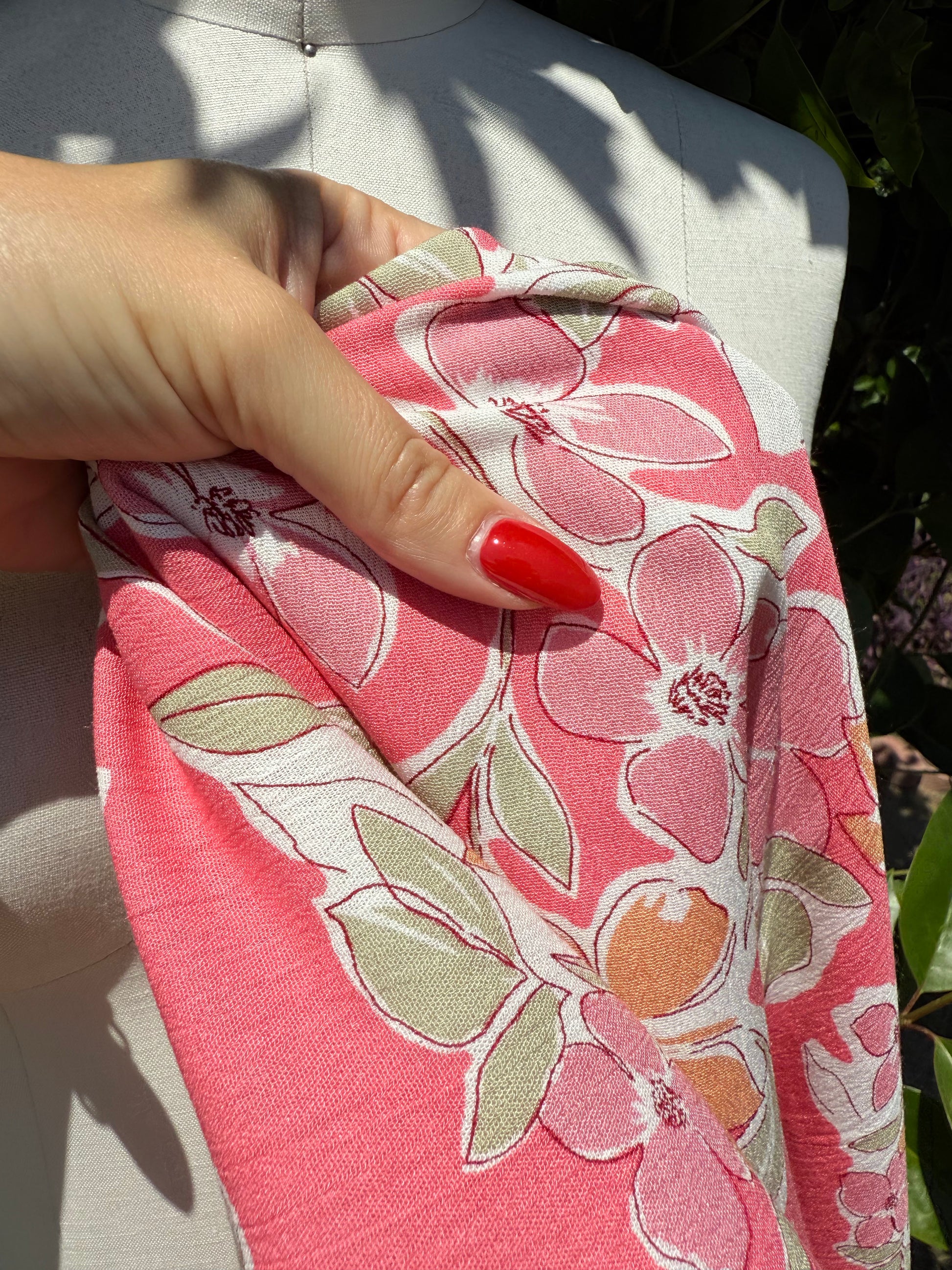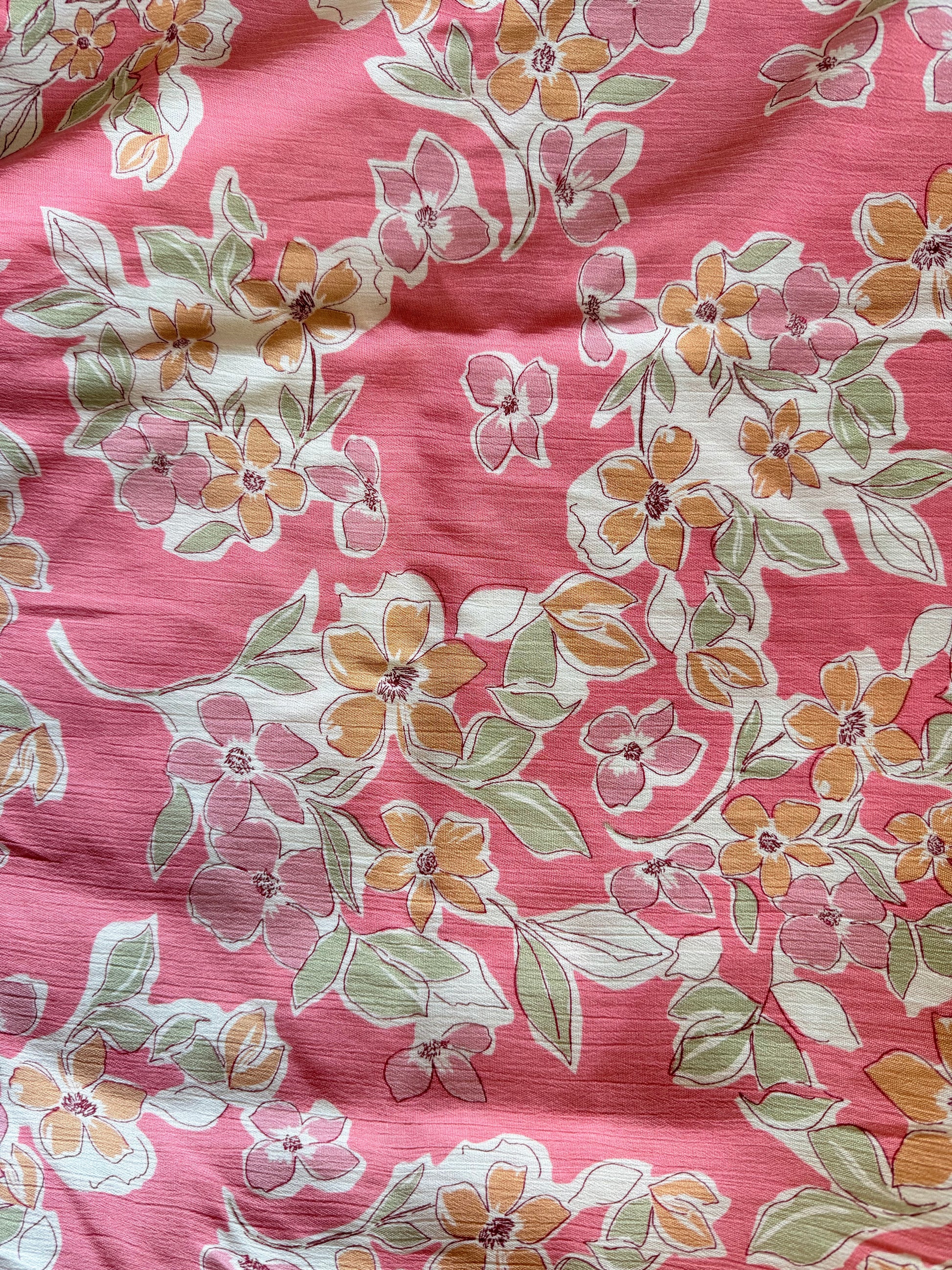 Elevate your sewing projects with this exquisite Pink Orange Green Off-white Floral Drawing Print Rayon Crepe fabric. Its soft, flowing texture and vibrant floral design bring a fresh, elegant touch to any creation. Perfect for dresses, blouses, or scarves, this rayon crepe offers both comfort and style, making your handmade pieces truly stand out. Available by the yard, it’s ideal for crafting unique garments that blend beauty with breathable fabric quality.