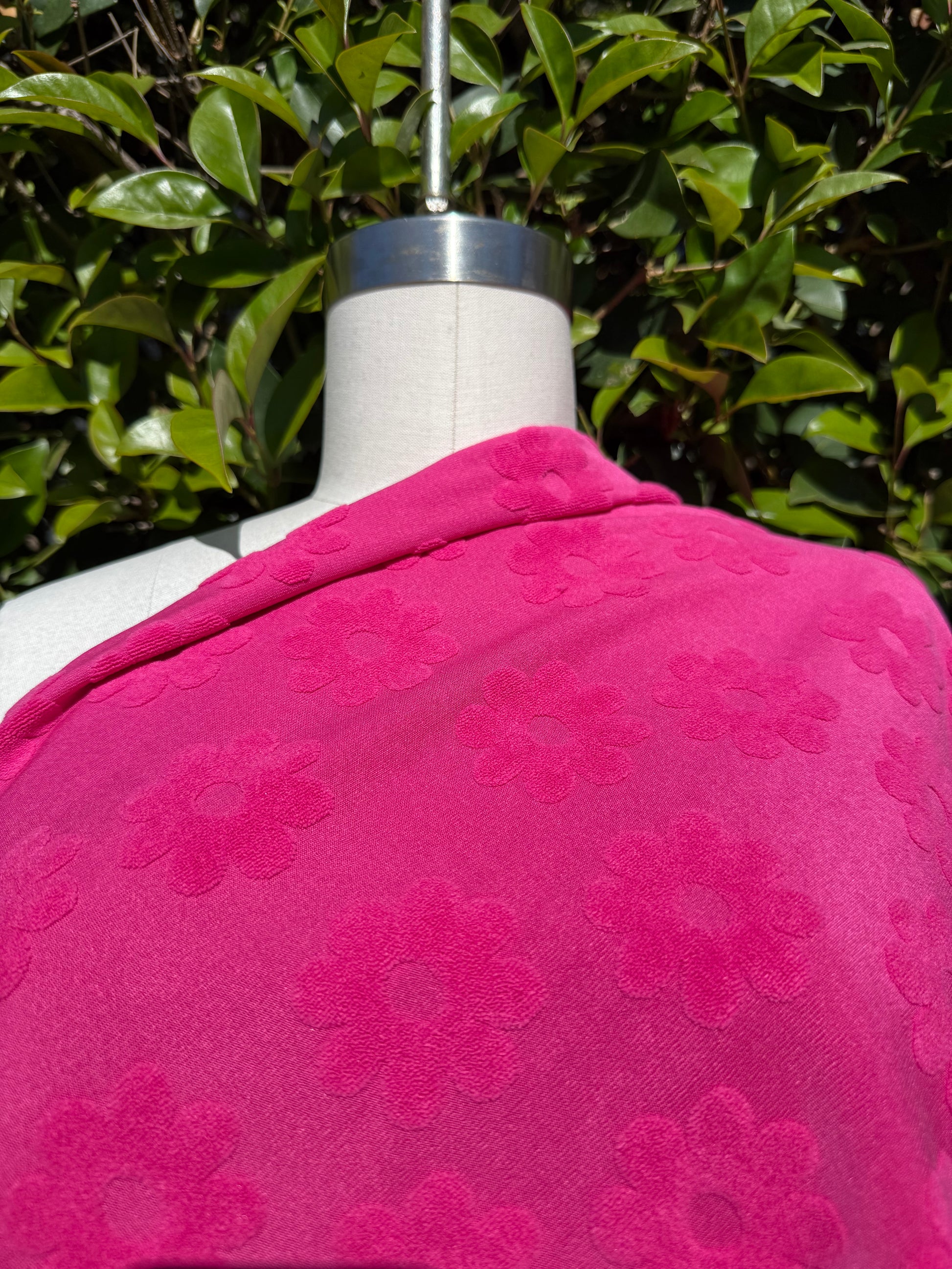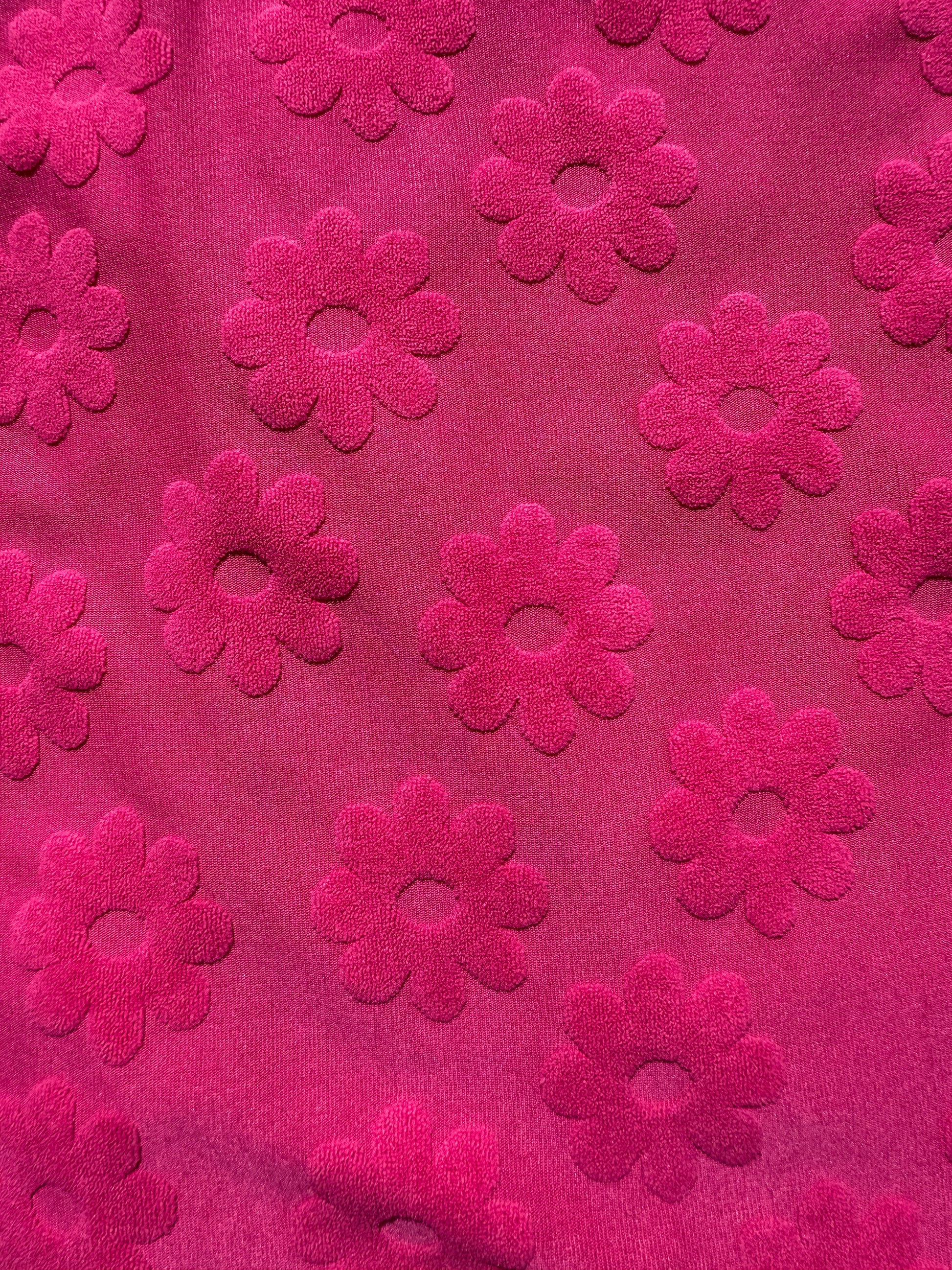 This vibrant pink terry cloth features a raised floral daisy jacquard pattern, perfect for adding a unique touch to your next sewing project. Made from durable polyester, it’s ideal for creating bathrobes, beachwear, towels, or light outerwear. This bright, deadstock fabric offers both style and practicality, making it a standout choice for comfortable, eye-catching garments and accessories.