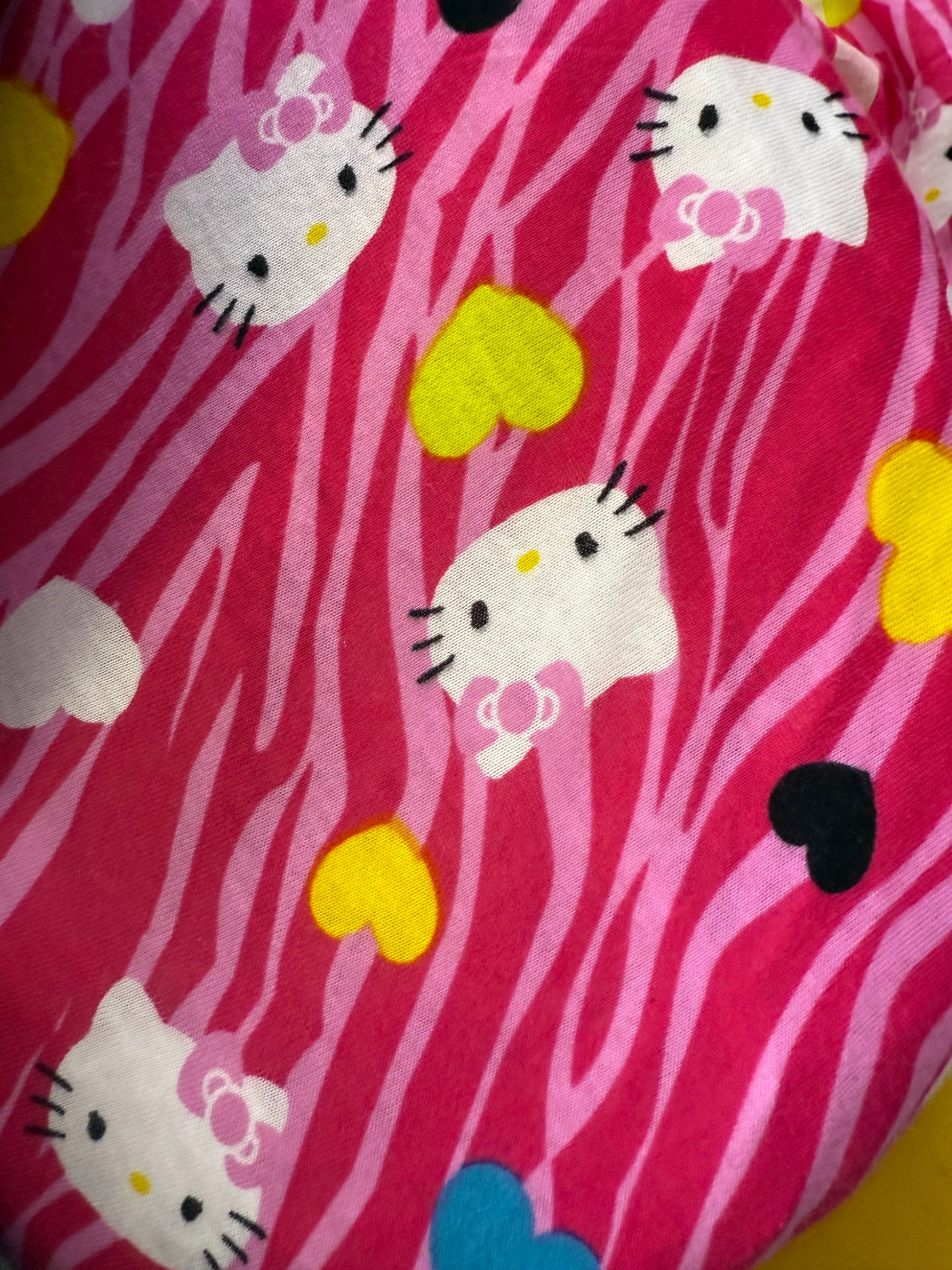 Add a splash of fun to your next sewing project with this playful fabric featuring Hello Kitty meets zebra stripes in pink, white, yellow, blue, and black hearts. Soft and stretchy, it’s perfect for creating youthful, retro-inspired garments or accessories that stand out with cute, vibrant charm. Let your creativity run wild with this delightful and unique print!
