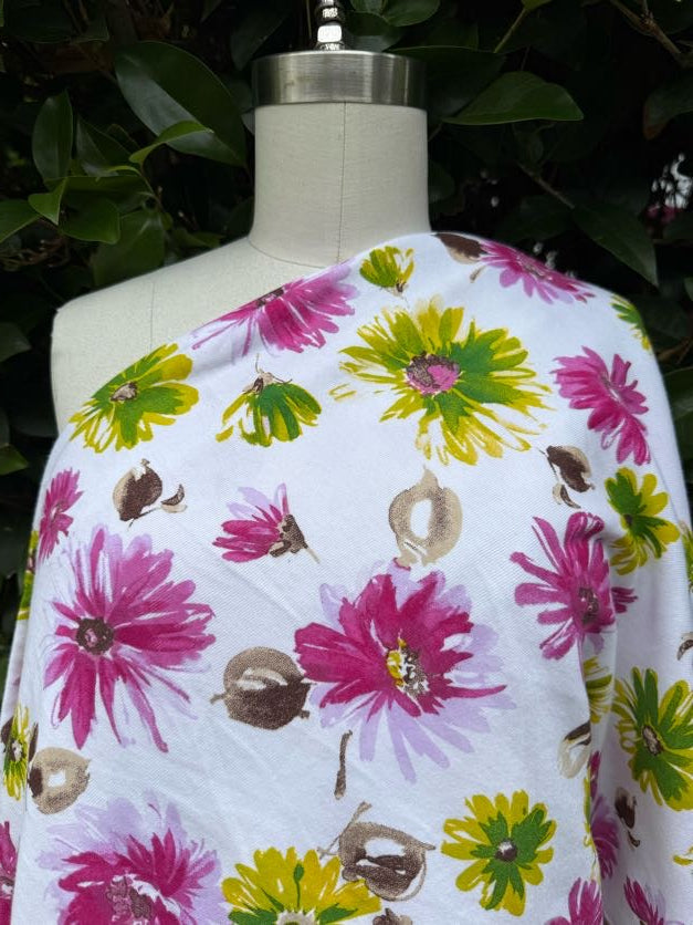 Add a splash of retro charm to your next sewing project with this Purple, Green, Brown, and White Floral Vintage Cotton Jersey. Soft and stretchy, this fabric brings the perfect blend of comfort and style, featuring a playful "Crazy Daisy" pattern that’s sure to brighten any creation. Ideal for dresses, tops, or cozy loungewear, it’s your go-to fabric for fun, vintage-inspired looks!