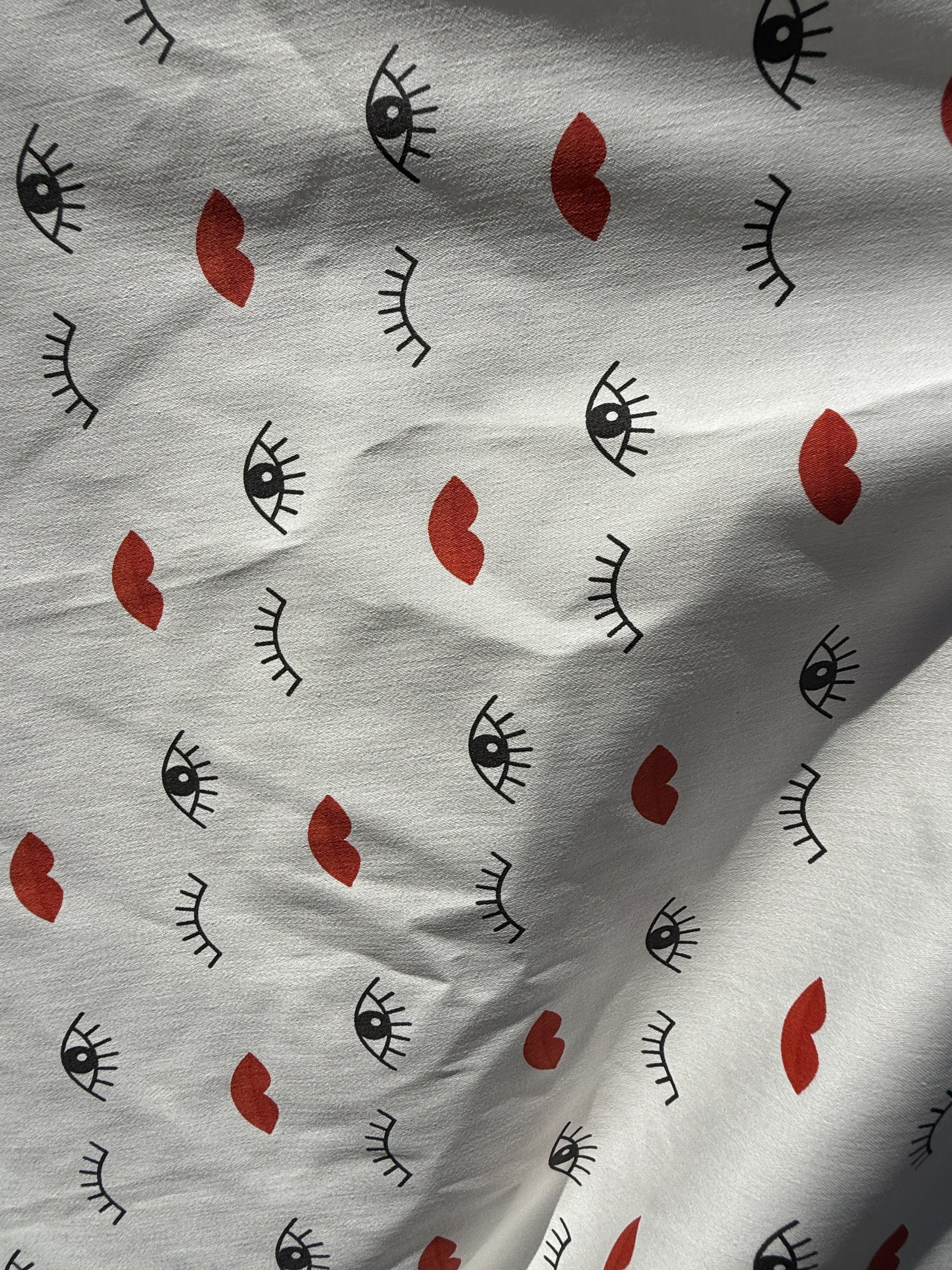 This cotton spandex sateen fabric features a funky, retro-inspired white, black, and red eye lip print that adds a bold statement to your sewing projects. Perfect for creating standout pants or other unique garments, its woven texture offers both comfort and durability. Ideal for those looking to infuse personality and style into their wardrobe with a playful yet wearable pattern.