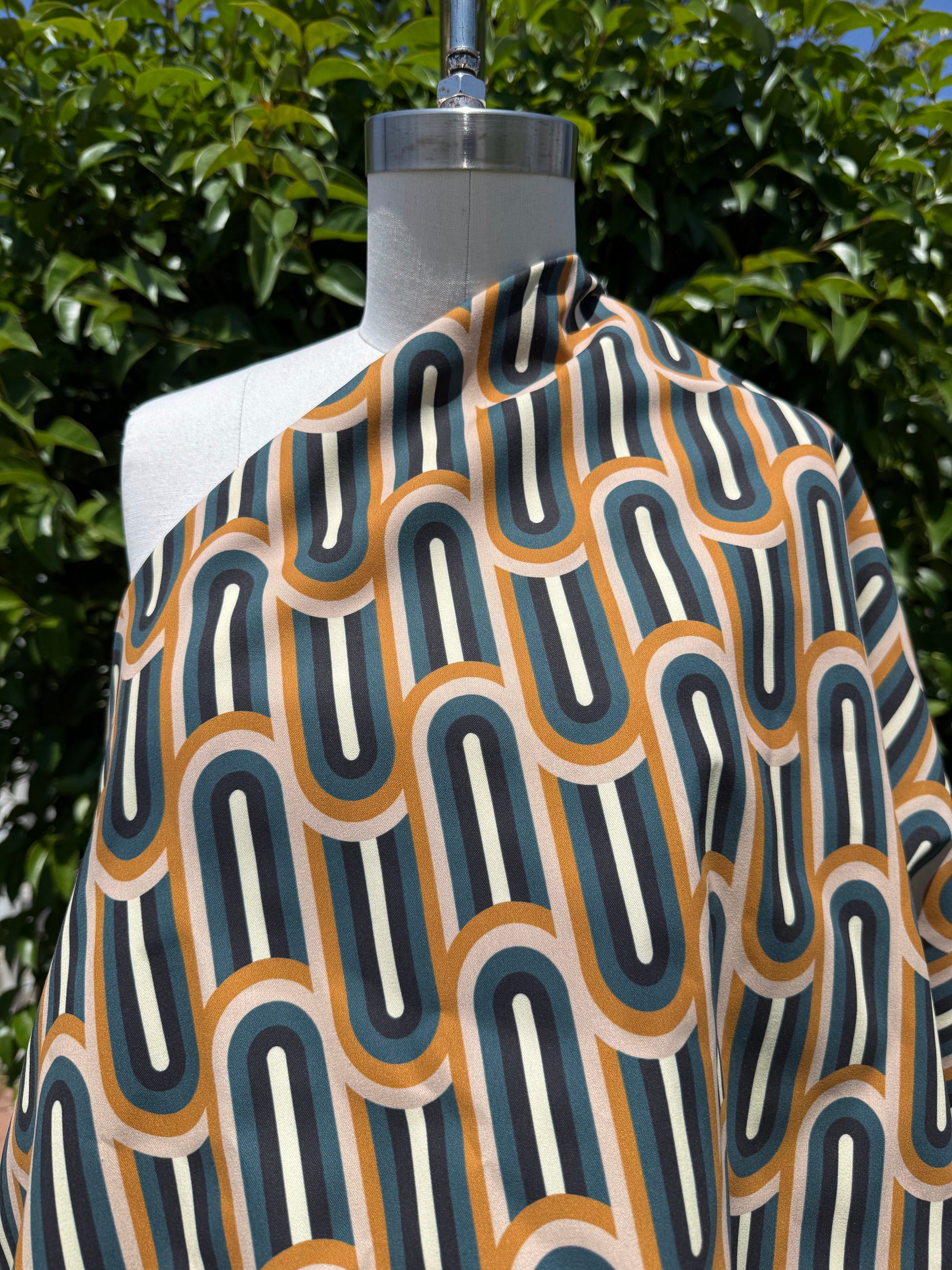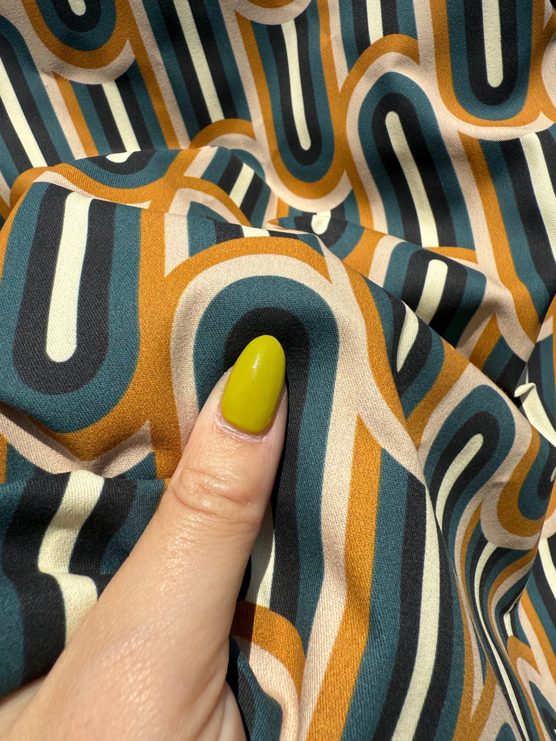 Add a bold, funky touch to your sewing projects with this lightweight cotton twill fabric featuring curved retro stripes in white, blue, black, and gold. Its smooth weave and vibrant pattern make it perfect for creating standout garments and accessories that demand attention. Elevate your designs with the dynamic energy of "Retro Wave" and bring a fresh, stylish vibe to every stitch.