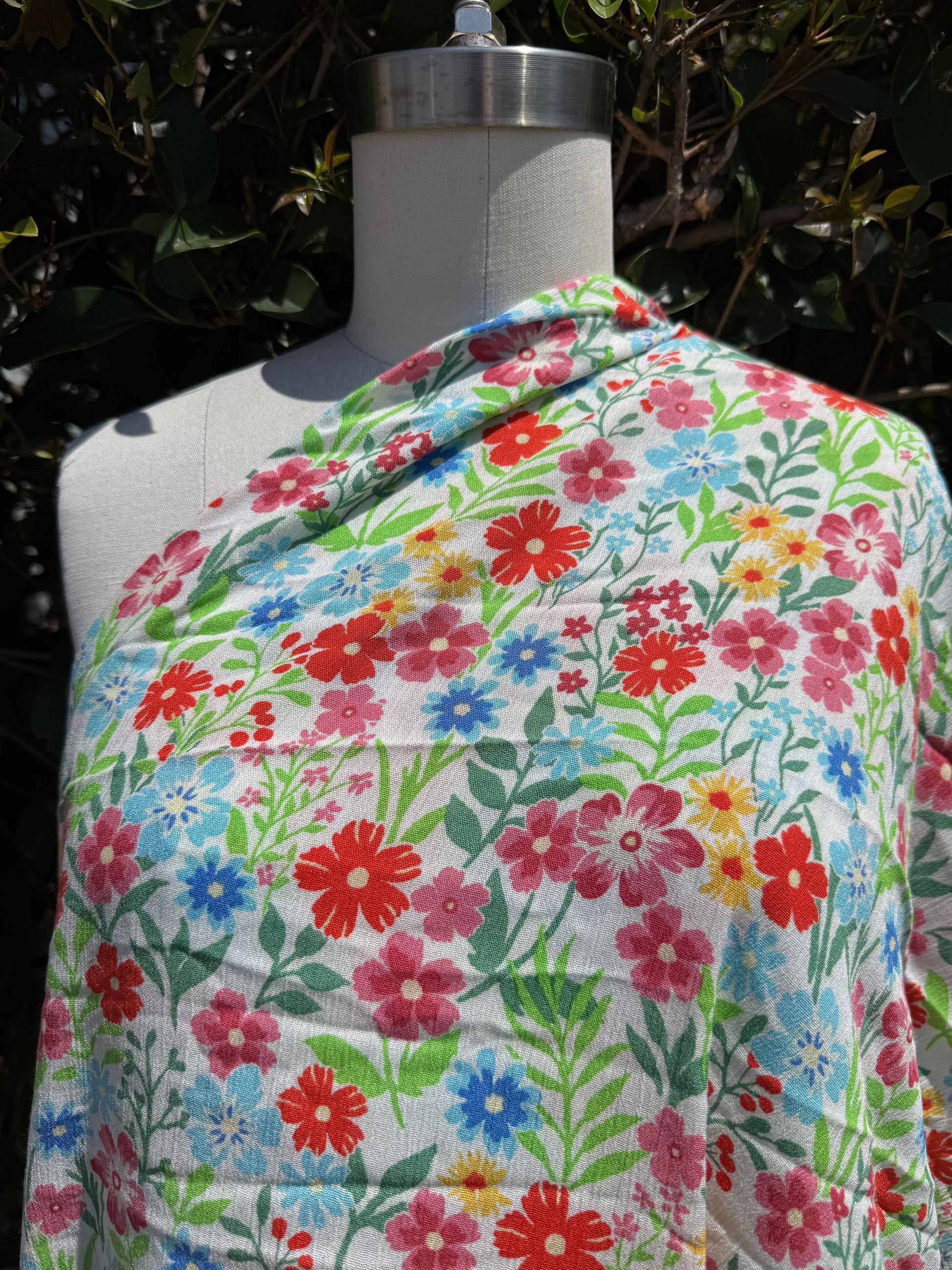 White Blue Red Green Multi Color Ditsy Floral Rayon Challis "Off To The Meadow"