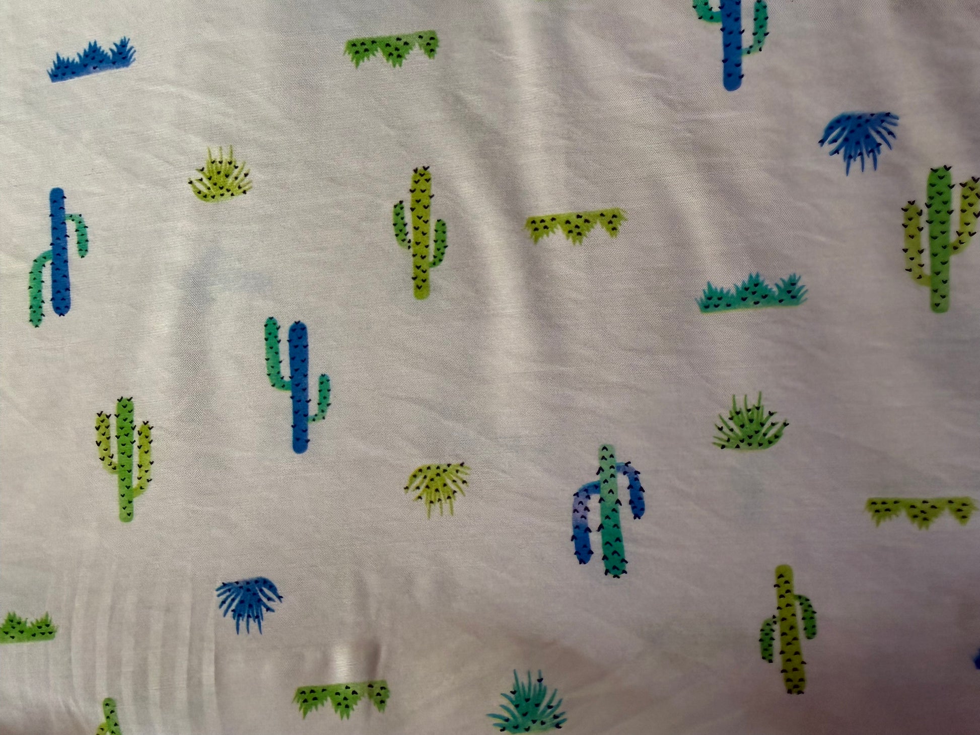 Escape to the desert with this breezy rayon challis featuring a charming cactus print in white and green. Perfect for lightweight dresses, shirts, and flowing garments, this deadstock fabric drapes beautifully and feels soft against the skin. Sold by the yard, so you can cut exactly what you need for your next sewing project. Channel your inner wanderer—one yard at a time.