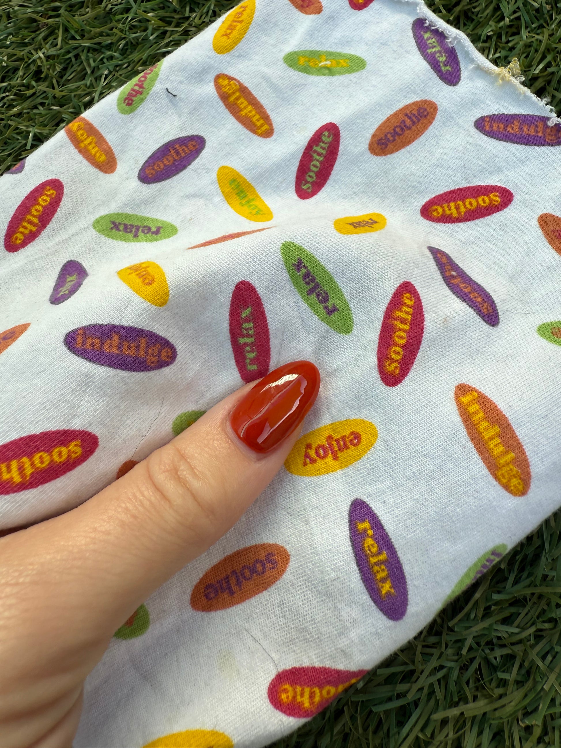 Get ready to sew something that brings the good vibes! This cotton spandex jersey features a whimsical jelly bean-inspired "Chill Pill" print with cheerful words like "enjoy," "soothe," and "relax" scattered across a white base in punchy yellows, greens, and purples. The stretchy blend makes it perfect for comfy tees, loungewear, or any project that deserves a mood boost. Sold by the yard from deadstock inventory—grab this playful fabric while it lasts and add some feel-good flair to your next creation!